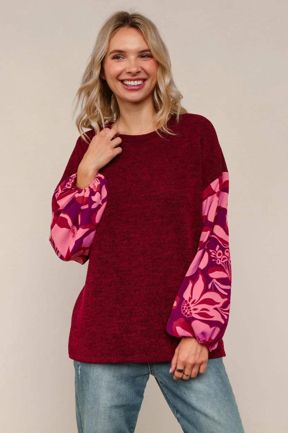 When cozy meets confident 🌺 The Boldly Blooming Top brings all the personality with its rich berry knit body and statement floral sleeves that add the perfect pop of pink. The relaxed fit keeps it comfortable and easy to wear, while the bold color combo gives your outfit instant “I tried without trying” energy.