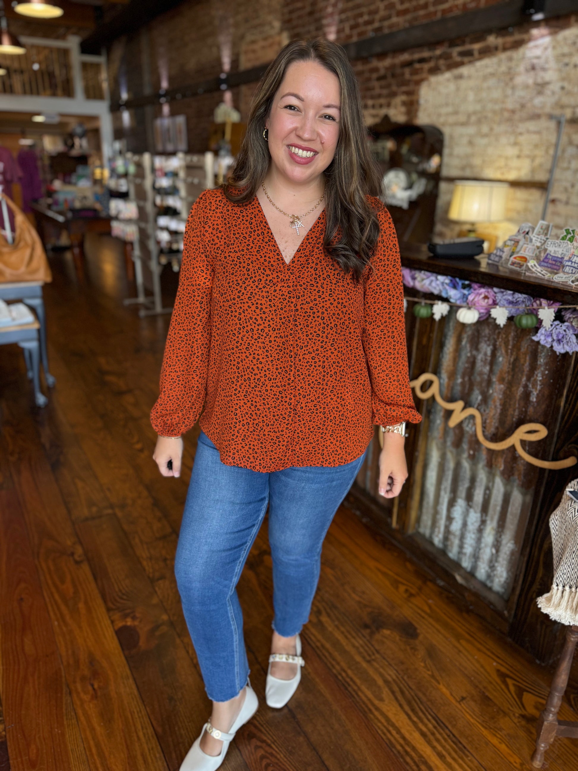 This one’s for the gals who love a little wild in their wardrobe. The rich rust hue and subtle leopard print are a match made in fall fashion heaven. It’s comfy, flowy, and full of personality—just like you.