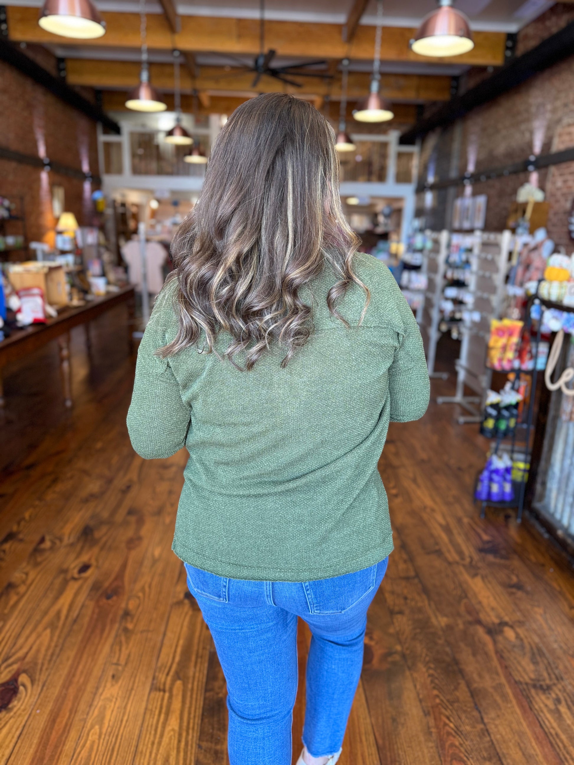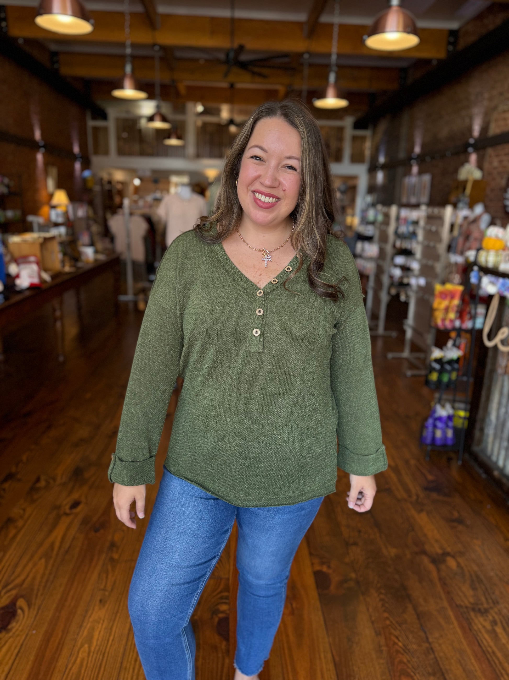 The Slow Mornings Top is made for those grab-a-coffee, linger-a-little kind of days. This cozy thermal-style henley features a relaxed fit, functional buttons, and roll-tab sleeves so you can wear it your way. The deep olive tone makes it a great transition piece you’ll reach for again and again.