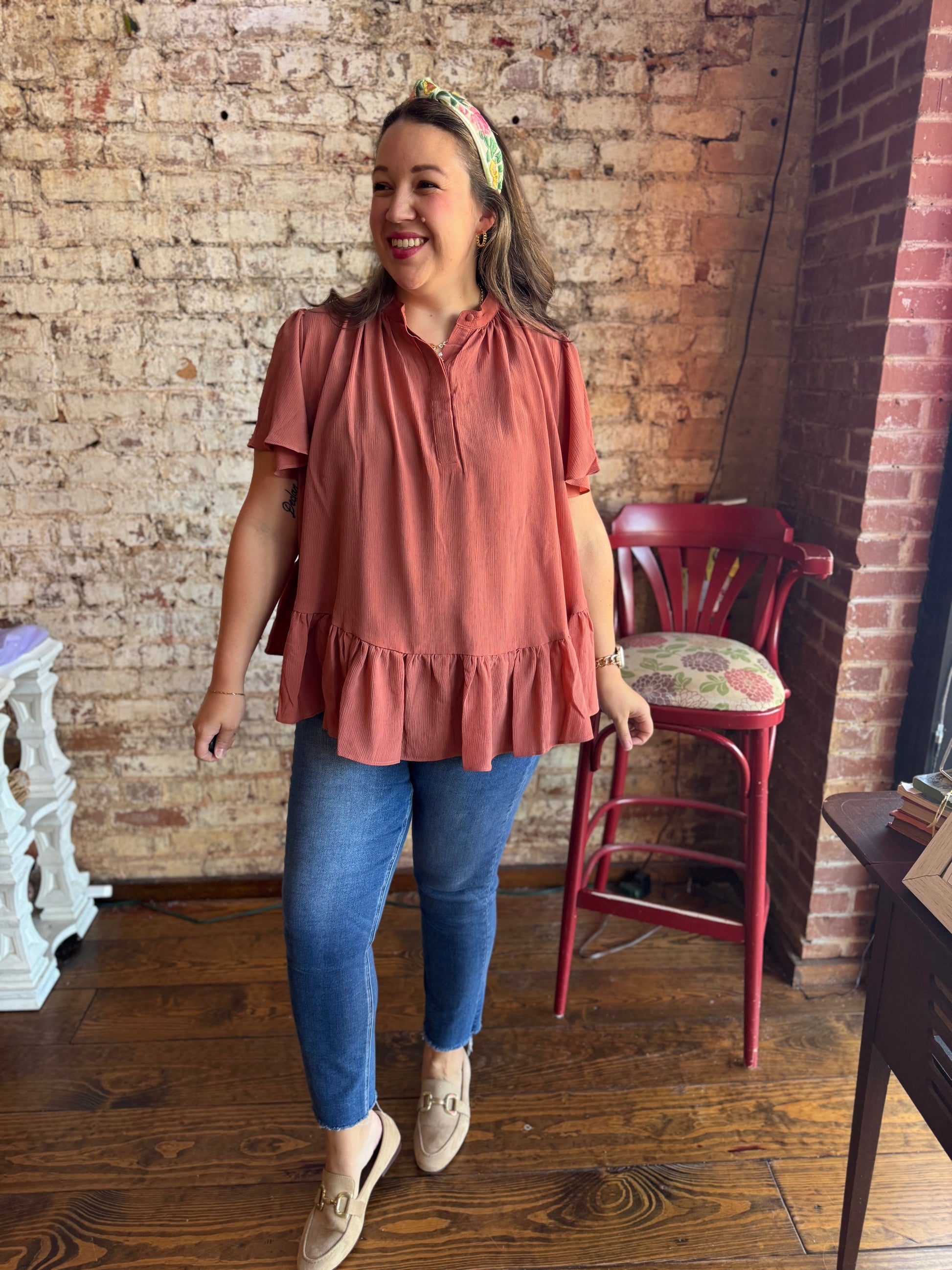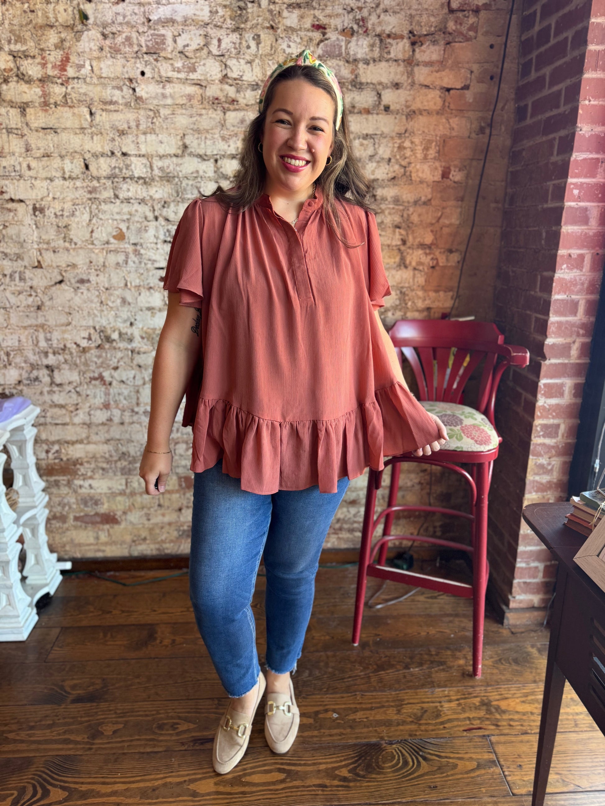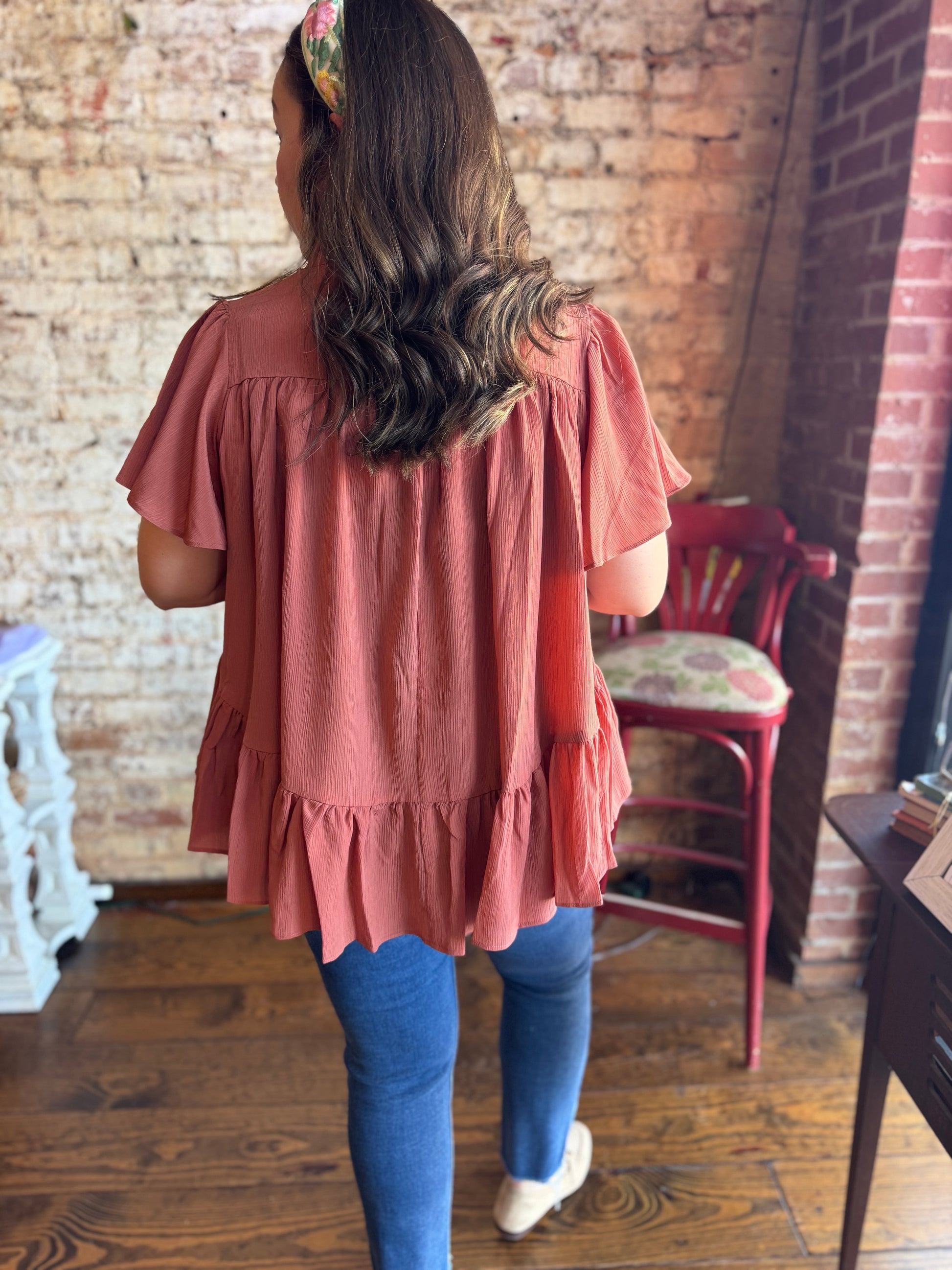 Soft, breezy, and effortlessly pretty — The Sunset Sway Blouse is a go-to for busy mornings when you want to look pulled together with zero fuss. The flutter sleeves and gathered hem add just the right amount of movement, while the rich mauve hue flatters every skin tone. Pair it with denim shorts now and layer it under a cardigan later — it’s the ultimate season-spanning staple.
