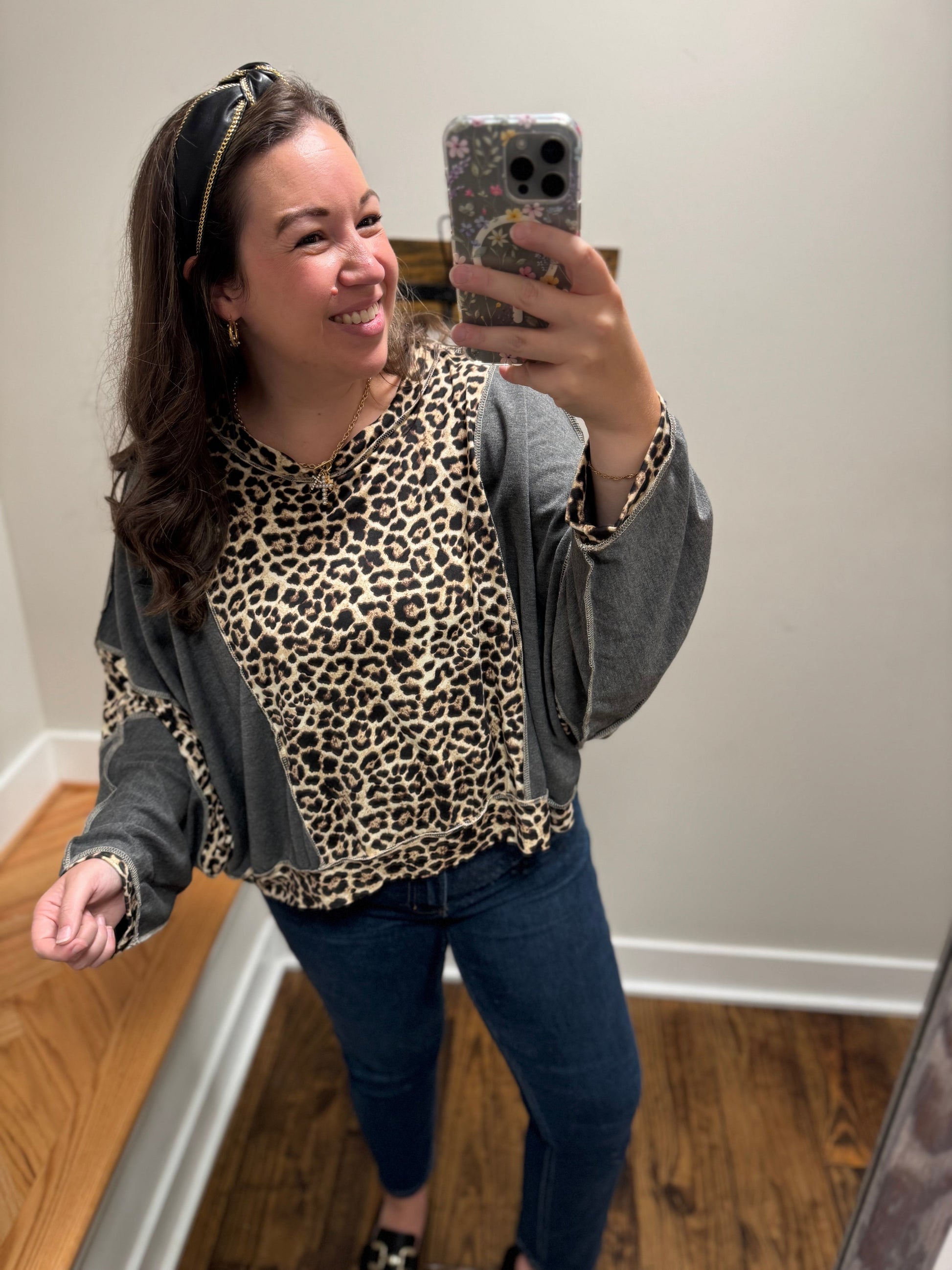 Add a little edge to your everyday with the Wild Side Pullover. Featuring a bold leopard print with soft charcoal contrast sleeves and hem, this top is comfy with just the right amount of sass. It’s the ultimate throw-on-and-go piece that still makes a statement.